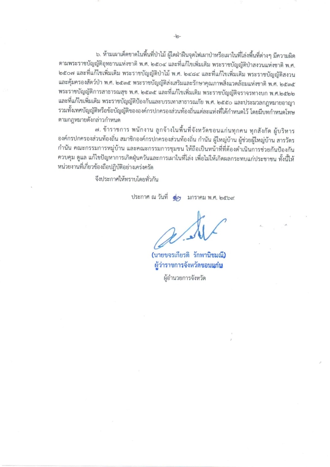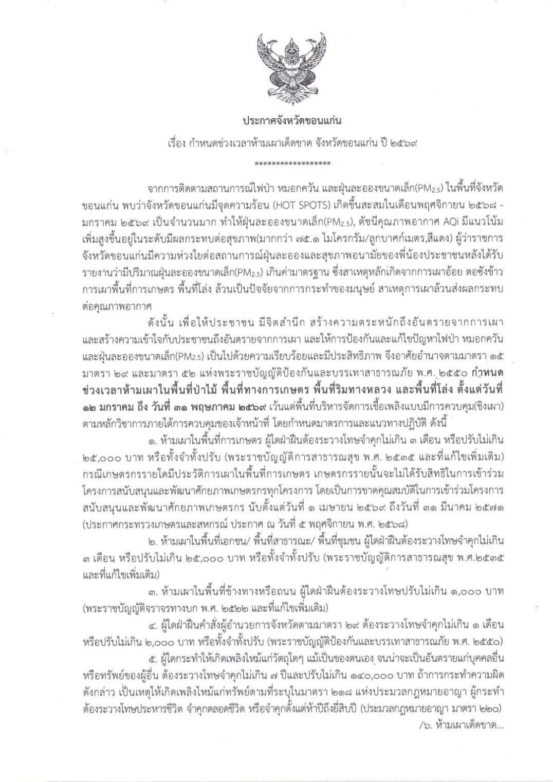 ประกาศจังหวัดขอนแก่น เรื่อง กำหนดช่วงเวลาห้ามเผาเด็ดขาด จังหวัดขอนแก่น ปี 2569