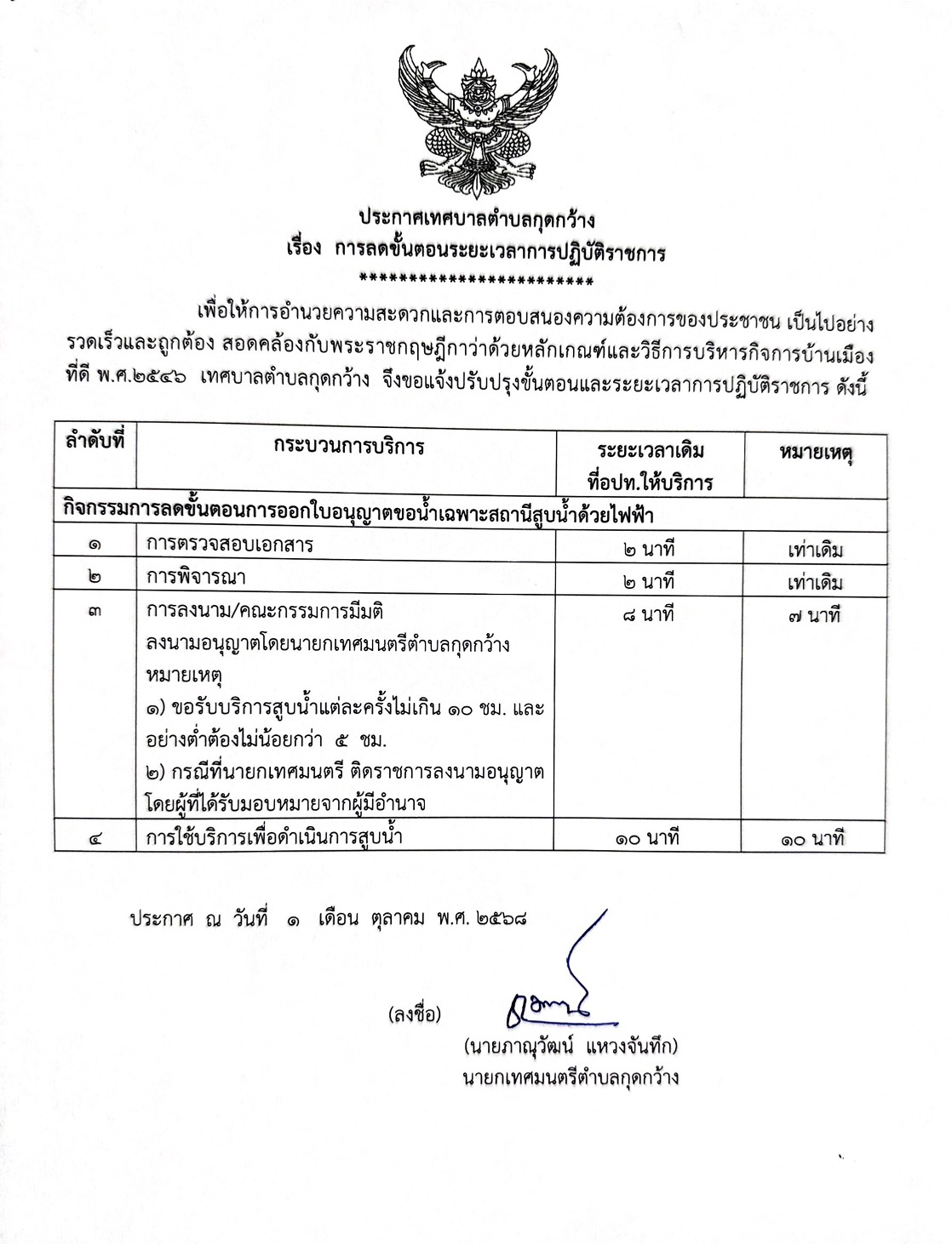 ประกาศเทศบาลตำบลกุดกว้าง เรื่อง การลดขั้นตอนระยะเวลาการปฏิบัติราชการ ประจำปี 2568