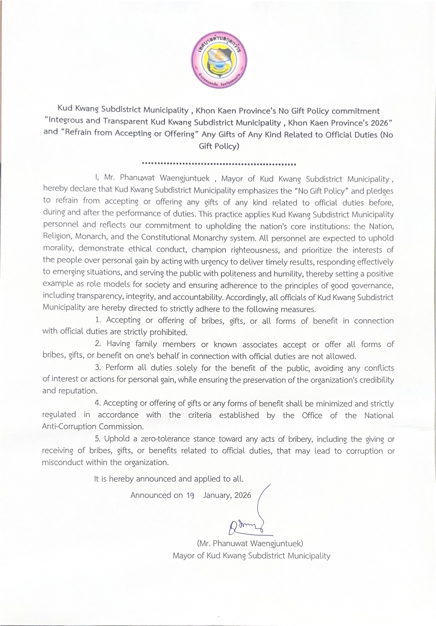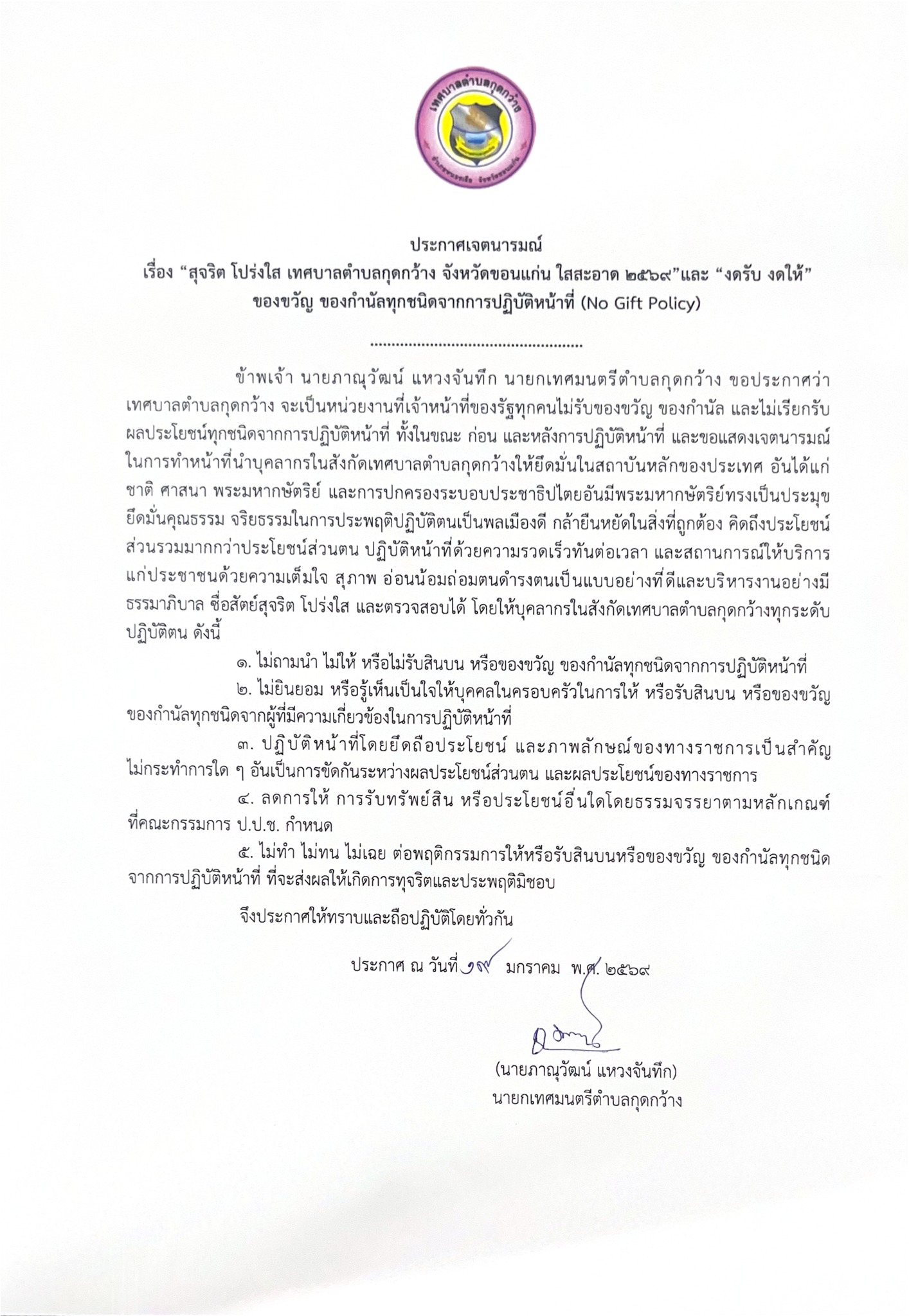 ประกาศเจตนารมณ์สุจริต โปร่งใส เทศบาลตำบลกุดกว้าง จังหวัดขอนแก่น ใสสะอาด ๒๕๖๙ และ งดรับ งดให้ ของขวัญของกำนัลทุกชนิดจากการปฏิบัติหน้าที่ (No Gift Policy)