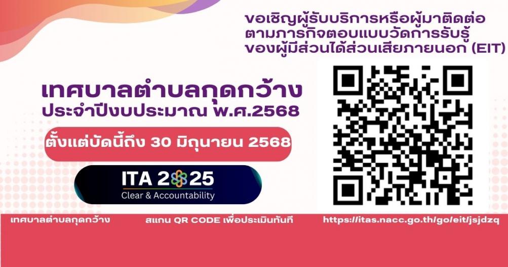 ขอเชิญผู้รับบริการหรือผู้มาติดต่อตามภารกิจของเทศบาลตำบลกุดกว้าง ตอบแบบวัดการรับรู้ของผู้มีส่วนได้ส่วนเสียภายนอก (EIT) ในรอบปีงบประมาณ พ.ศ. 2568